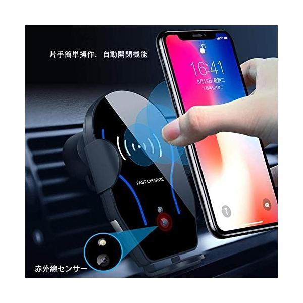 【Qi技術採用】:車載Qi ワイヤレス充電器スマホホルダーはクリップ式充電器と最新のワイヤレススマホ充電を採用します。固定ベースと通気孔の設置して、脱落防止することができます。360度自由自在に角度調整が可能、スマートフォンの充電にたっぷり体験することができます。 【タッチ自動開閉】:赤外線センサー内臓して、一度10CM以内にホルダーに携帯電話を近づけると、ホルダーのクリップが自動的に閉じて携帯電話を締めます。電話機を取り出す方法は側の金属ボタンを押すと、クリップが自動的に開けます。 【Qiワイヤレス急速充電】:Qi高速ワイヤレス充電器は最新の強化銅線コイルを使用して、充電速度は通常のワイヤレス充電器よりも50%速いです。急速充電の入力は15W、10W、7.5Wの充電モードに電力を調整することができます。 2&1車載スマホホルダー】:エアコン吹出し口に取付けて、車載ホルダーとして、360度調整できて、運転する時はとても便利で安全です。スマホホルダーとして自宅で使用することができます。 【多機種対応】:クランプは5.1 cmから7.7 cmまで拡張可能で、4-6.5インチの携帯電話やGP